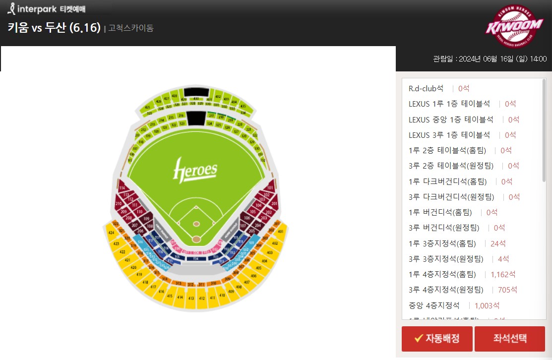 그럼 다음과 같이 고척돔 좌석과 잔여 좌석 수가 나오게 됩니다. 키움히어로즈 팬은 1루쪽이고, 고척돔 원정팀은 3루쪽으로 선택 하시면 되겠습니다.
