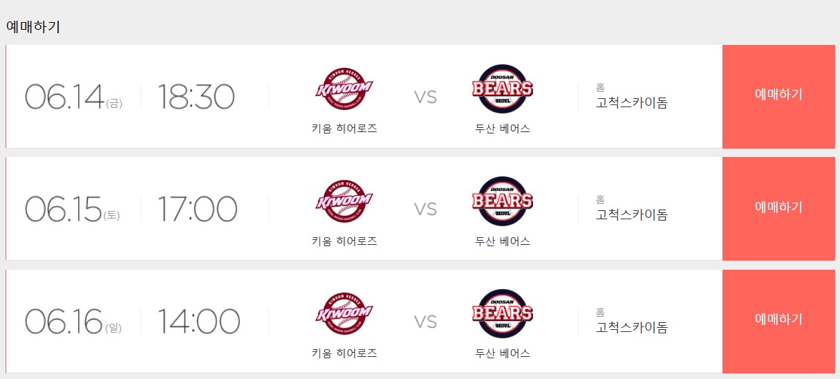 다음은 위 링크 버튼으로 접속한 인터파크 티켓 내 키움히어로즈 티켓 예매 화면입니다. 다음 화면 중 가고자 하는 경기 일정을 확인 한 뒤 오른쪽 [예매하기]를 눌러주세요.