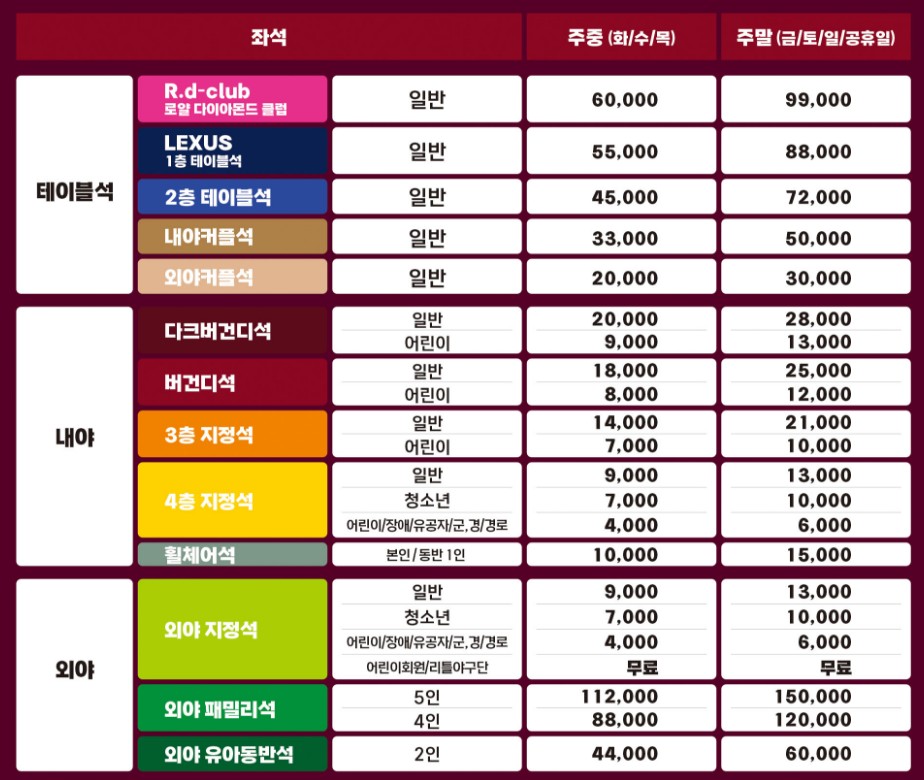 테이블석은 주말 기준외야 커플석 30,000원부터 R.d-club 좌석 99,000원까지 이루어져있으며 이가격은 주말 기준 가격입니다. 평일 가격은 주말 가격보다는 더 저렴하다고 볼 수 있습니다.