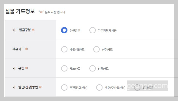 그다음 국민내일배움카드를 신청하여 줍니다. 이 카드는 신용카드또는 체크카드 중에서 고를 수 있고, NH농협카드사, 신한카드사 중에서도 선택이 가능합니다. 기존에 카드가 있다면 재사용이 가능하고, 저는 체크카드로 사용하고 싶어서 신규발븝-체크카드를 선택하여 주었습니다. 선택한 카드는 전화신청, 모바일신청, 은행방문 신청으로 가능하며 원하는 방법으로 신청하시면 됩니다.
