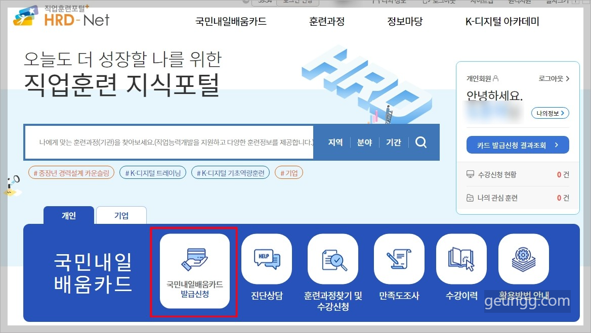 직업훈련포털 HRD-Net에 접속하셔서 메인화면에 있는 국민내일배움카드 발급신청을 눌러주세요