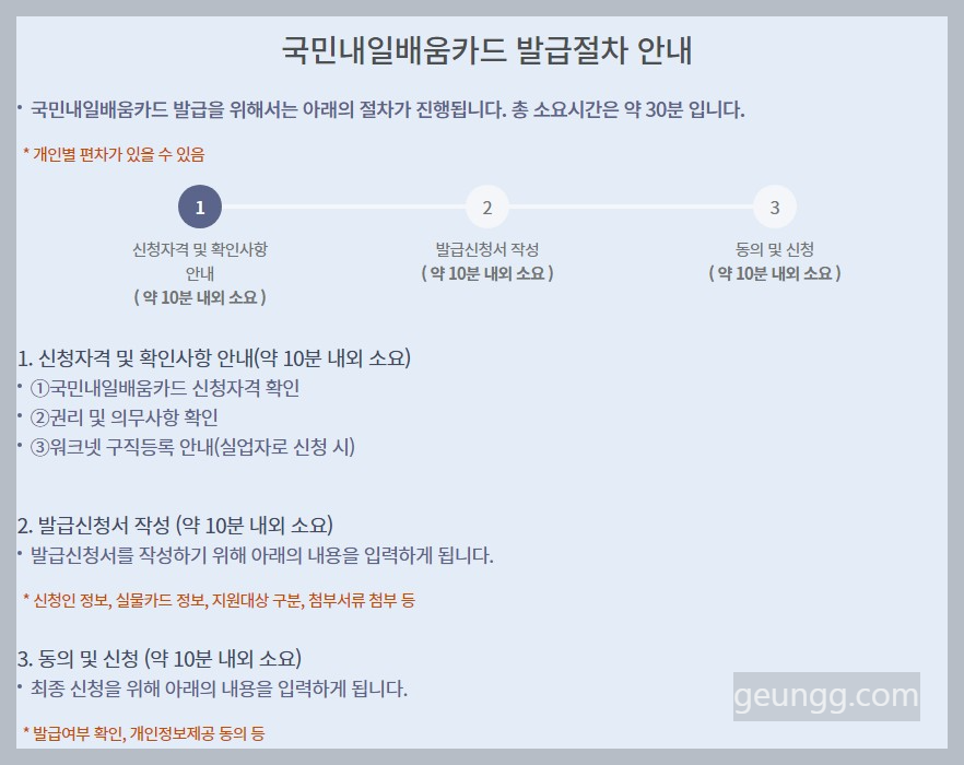 국민내일배움카드 신청 발급 절차입니다. 꽤 오랜 시간 걸리기 때문에 시간적 여유를 가지고 신청하시는걸 추천드립니다.