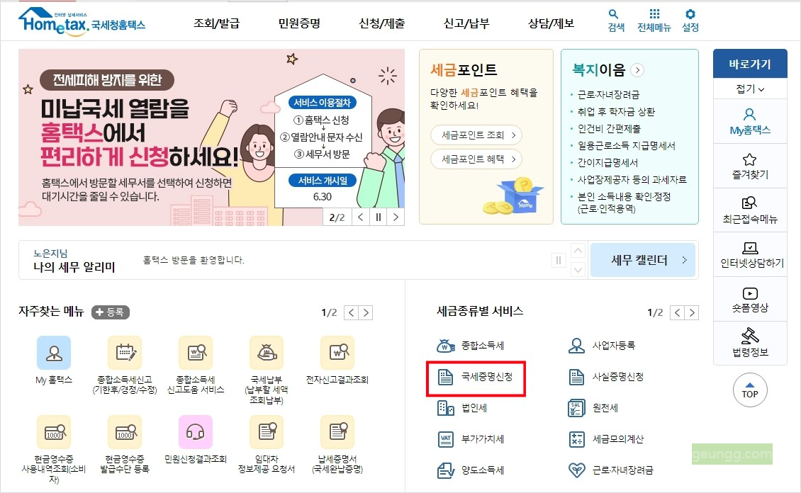 상단의 민원증명을 누르면 납세증명서 항목이 있고, 아니면 메인 화면에서 국세증명신청을 누르시면 됩니다. 또한 검색을 통해 국세완납증명서를 검색해서 진입하셔도 됩니다.