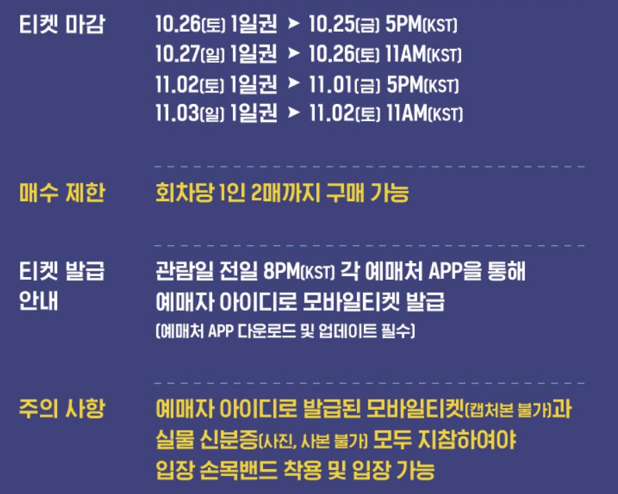 티켓은 현재 구매할 수 있는 상태로 인터파크티켓과 예스24에서 구매하실 수 있습니다. 주의하실 점으로는 예매자 본인의 모바일 티켓과 실물 신분증 모두 지참하여야 입장 가능하다는 점 입니다.