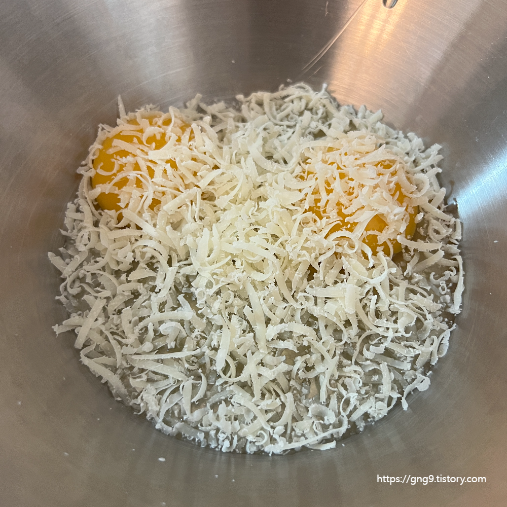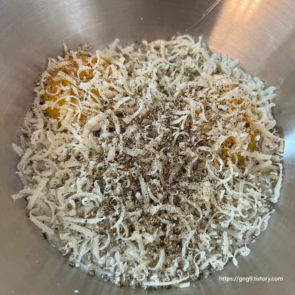 2. 면이 삶아지는 동안 소스를 준비 합니다. 크림 없이 만드는 파스타로 계란과 치즈가 필요합니다. 계란은 2알이 필요하며 노른자로만 준비 합니다. 저는 흰자를 포함해서 만들어보았습니다. 노른자를 분리하여 담아준 뒤 파마산 치즈를 가득 뿌려줍니다. 그리고 심하다 싶을 정도로 많은 양의 후추를 뿌려줍니다.