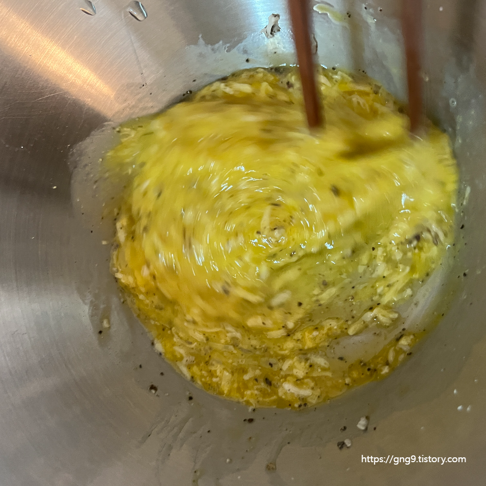 3. 후추를 어느정도 뿌려줬으면 소금을 한꼬집 넣어 준 뒤 잘 섞어줍니다. 섞다보면 점점 치즈가 녹아 그럴싸한 소스의 모습이 됩니다.