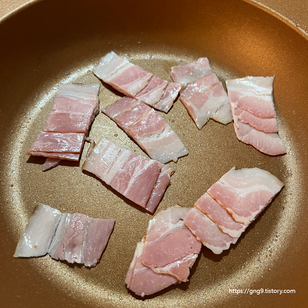 4. 소스가 다 만들어졌다면 베이컨을 구워줍니다. 진짜 까르보나라는 관찰레라는 베이컨의 종류를 사용하지만, 관찰레가 없는 관계로 베이컨을 구워줍니다. 많으면 많을수록 까르보나라의 맛은 up!