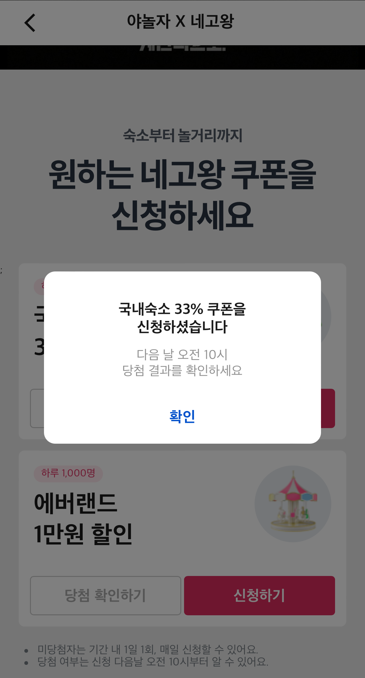국내숙소 33% 쿠폰 신청을 하니, 다음날 오전 10시에 당첨 결과를 확인하라는 팝업이 떴습니다. 쿠폰 당첨을 확인 후 3일간 유효하니 미리 빠르게 여행 일정을 체크해서 쿠폰 혜택을 모두 받을 수 있게 계획을 해야겠습니다.