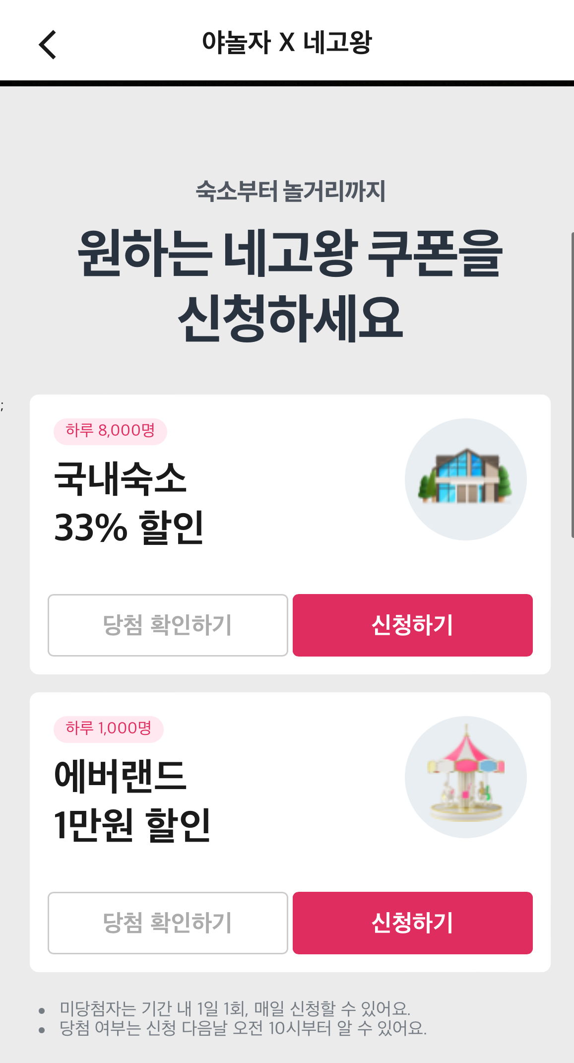 저는 국내숙소 33% 할인과, 에버랜드 할인권 모두 오늘 신청하였습니다. 평소에 여행을 갈 때 야놀자를 자주 이용하는 편이라 어플이 있어서 편하게 응모할 수 있었어요.