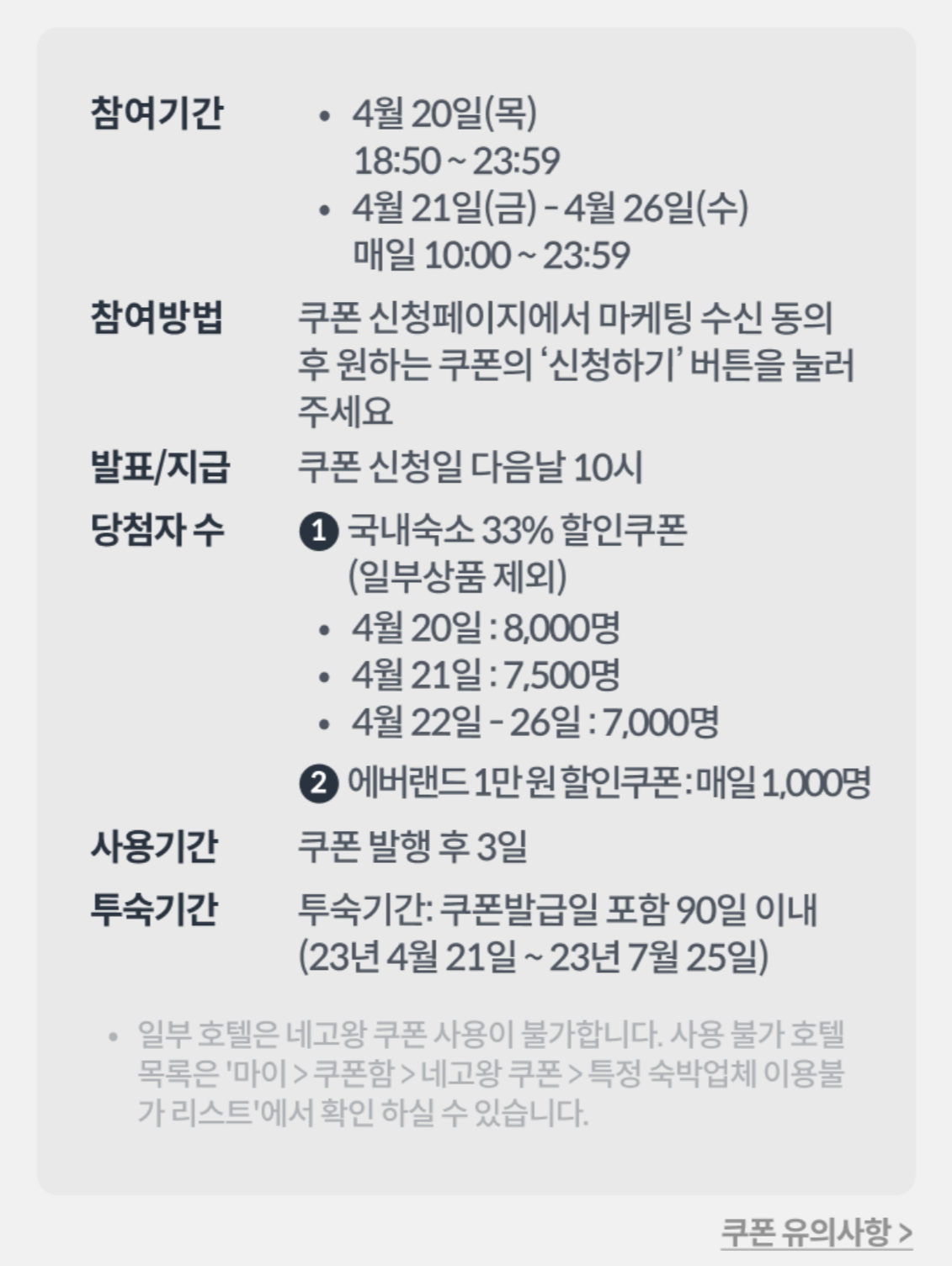 - 투숙기간: 쿠폰 발급일 포함 90일까지