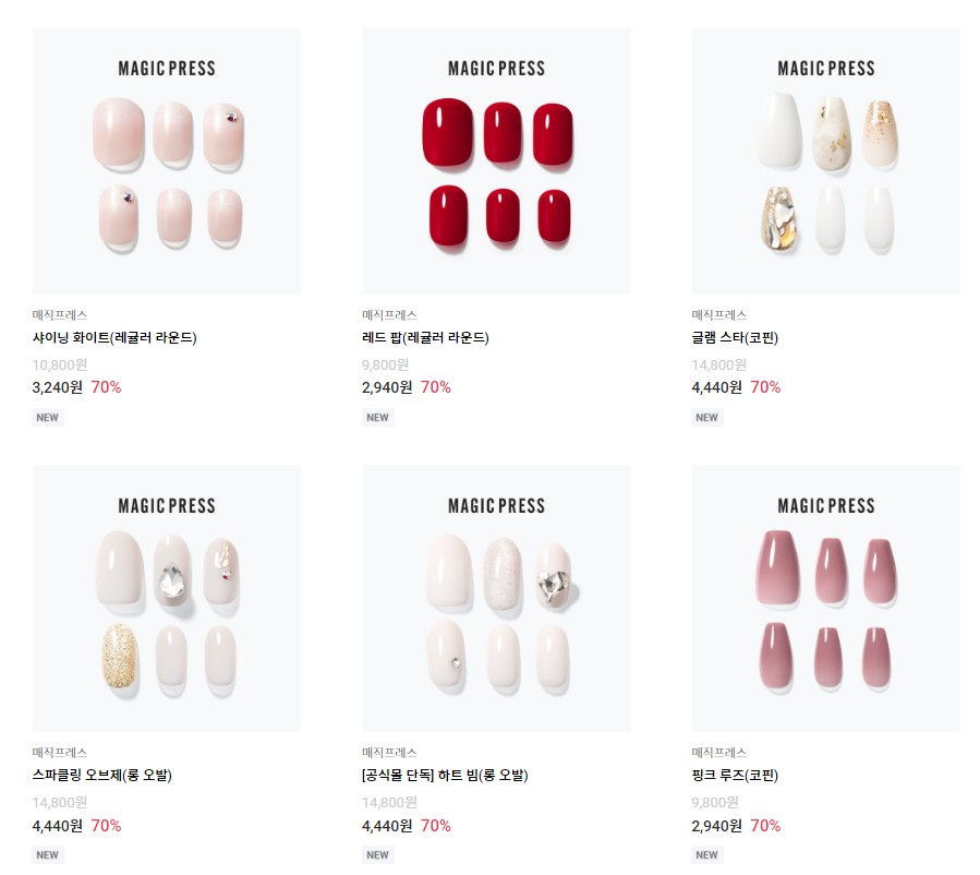 매직프레스는 70%의 할인을 하며 2천원대에서 4천 원대까지 다양한 가격대입니다. 다양한 쉐입이 있어 동그랗고 귀여운 디자인이나 파츠가 많이 붙어있고 긴 손톱의 네일팁등 고르는 재미가 있습니다.