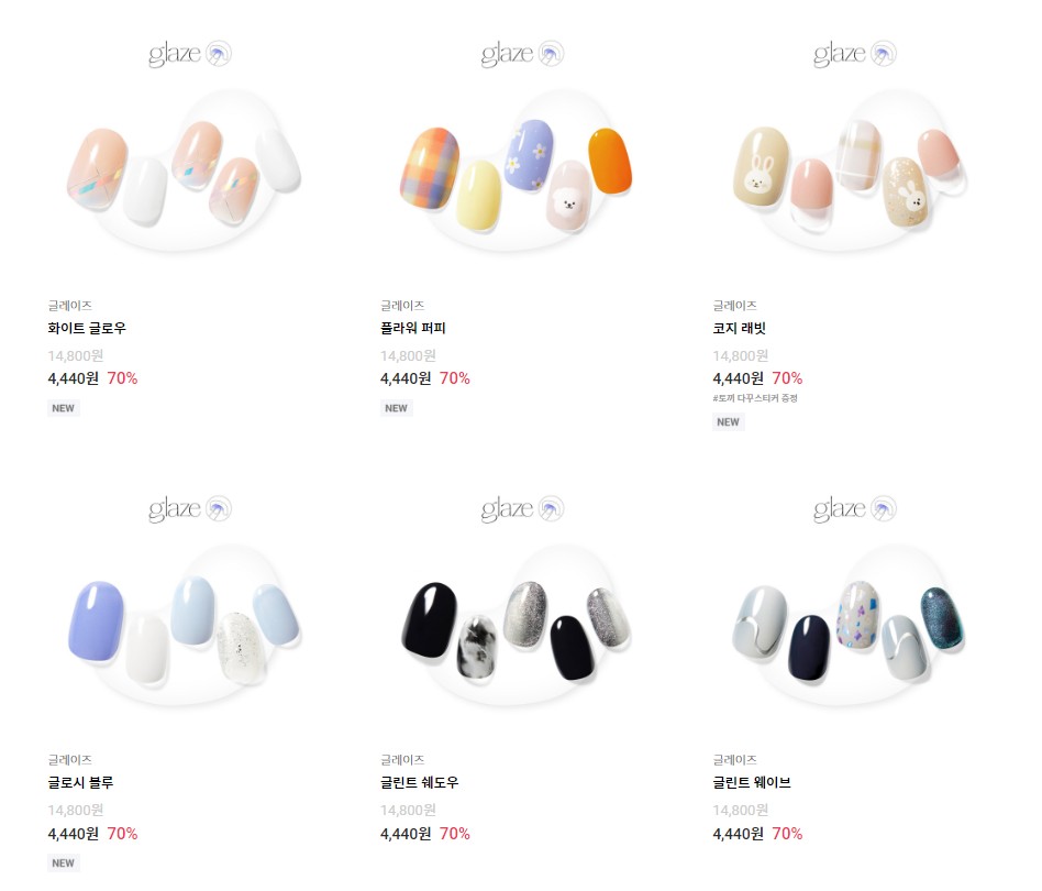 글레이즈는 진짜 네일샵에서 아트를 받은듯한 느낌이 나는 자연스러운 네일로 스티커의 형태이지만 젤램프에 구워 단단하게 연출할 수 있는 네일입니다. 70%의 할인을 하고 있어 4,440원에 구매할 수 있으며 이 제품을 사용하고자 하시는 분들은 꼭 젤램프가 필요합니다.