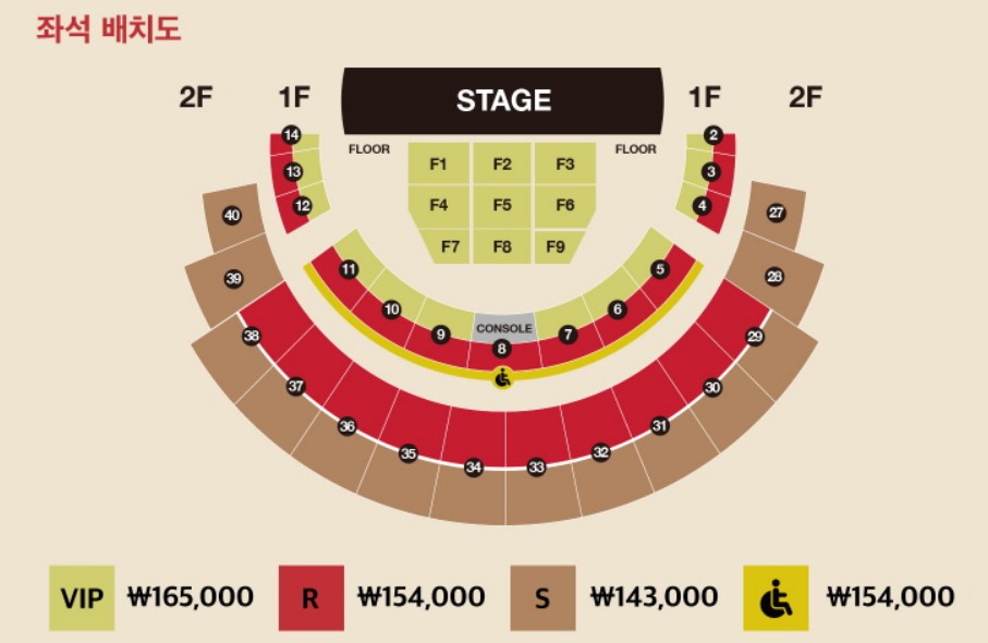 F1부터 F9까지는 단차가 없는 평지로, 스탠딩이 아닌 의자가 설치 될 예정입니다. 그 외 1F와 2F는 계단식 좌석이벼 각 구역의 1열이 무대와 가까운 좌석임을 참고 하셔서 예매 하세요.