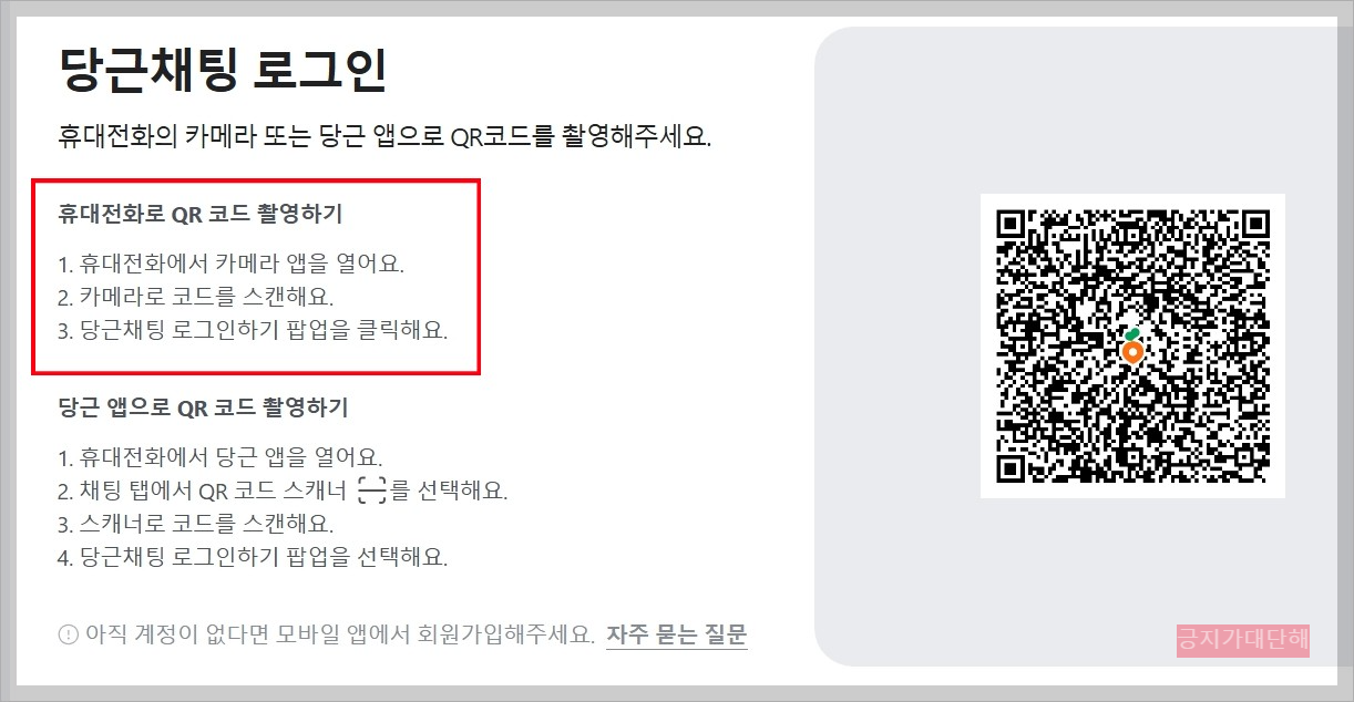 당근 pc버전에서 로그인은 핸드폰의 당근 앱에서 가능했습니다. 위의 큐알코드를 인식 해보면
