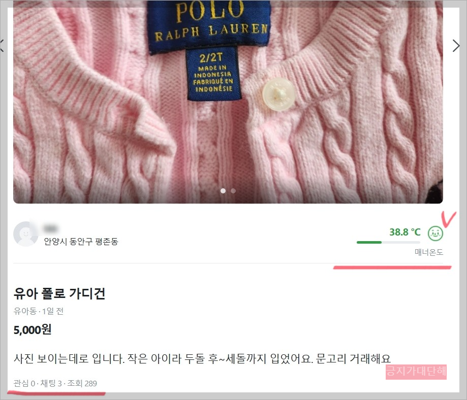 확인 하고자 하는 물건을 클릭하면 핸드폰에서 보는 당근 앱과 마찬가지로 판매자의 매너 온도, 사진, 물건 가격, 물건 설명 등을 모두 확인 할 수 있었습니다.