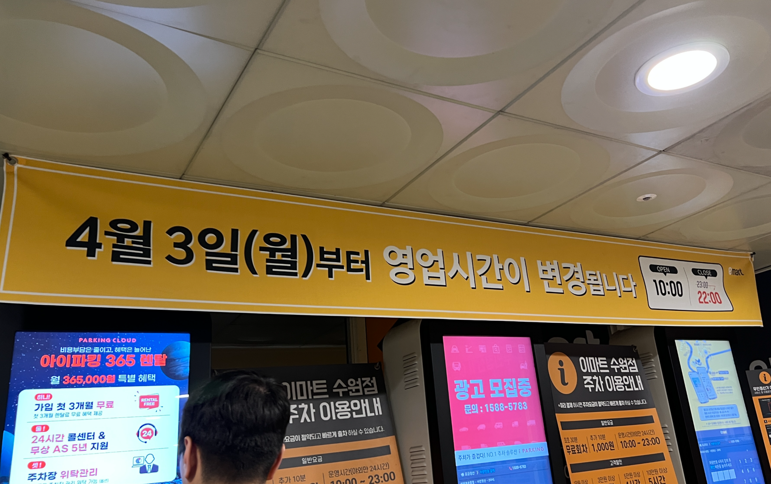 이마트같은 경우는 4월 3일 월요일부터 영업시간이 변경됩니다. 기존의 영업시간이 10시~23시였지만, 10시~22시로 단축 영업 합니다. 전국의 136개의 점포중 일부 23개의 점포는 이미 22시까지 영업으로 변경하여 운영을 했습니다. 다만, 방문객이 많은 이마트 왕십리점, 이마트 자양점, 이마트 용산점, 이마트 신촌점은 30분 더 영업하여 10시~22시 30분까지 영업합니다.