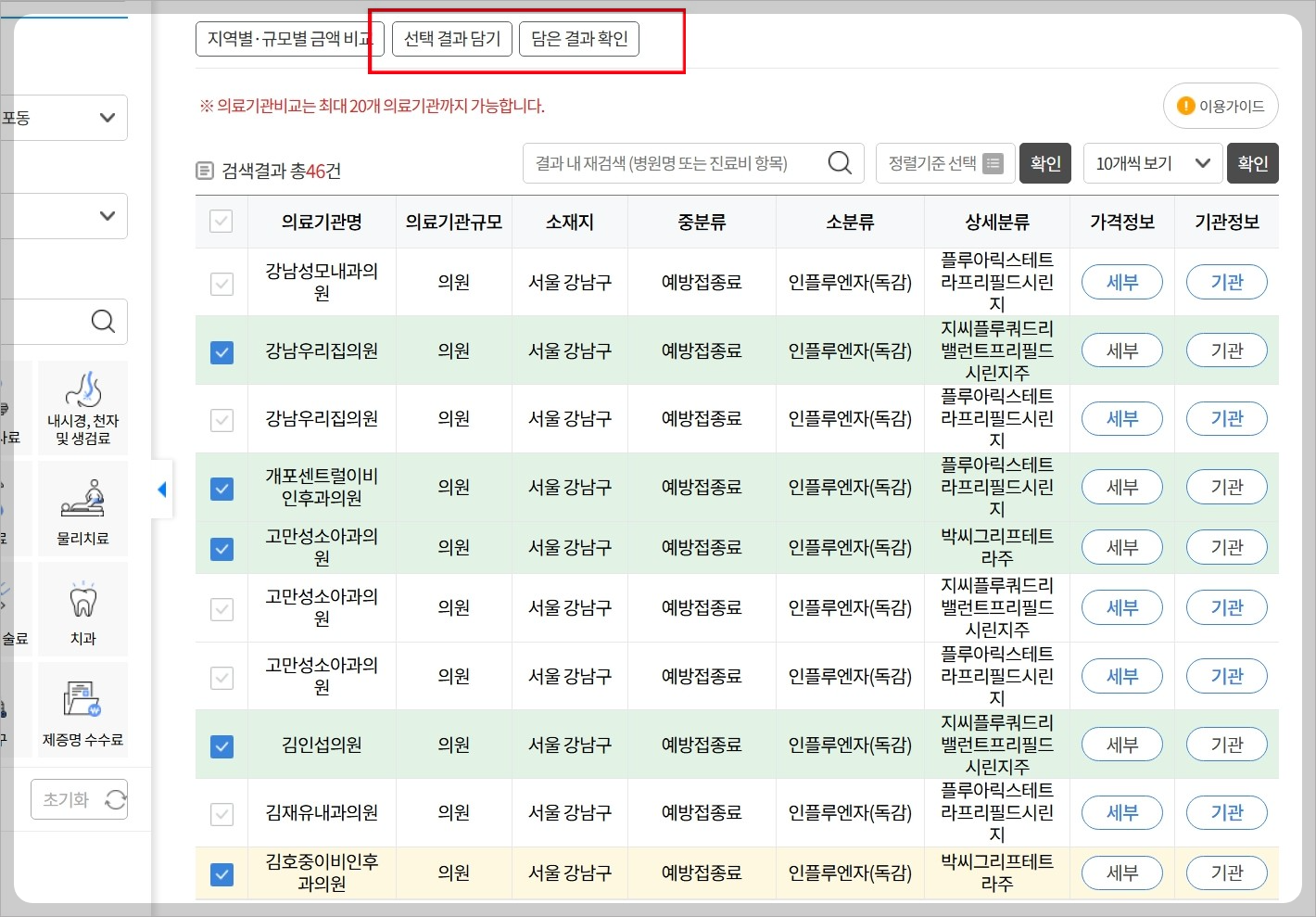 다만 한 페이지에 보이는 10개만 담을 수 있고 최대 20개까지 비교하실 수 있습니다. 이렇게 원하는 병원만 선택해서 담을 수도 있습니다. 선택 결과를 담은 후 담은 결과 확인을 눌러 가격 비교를 하실 수 있습니다.