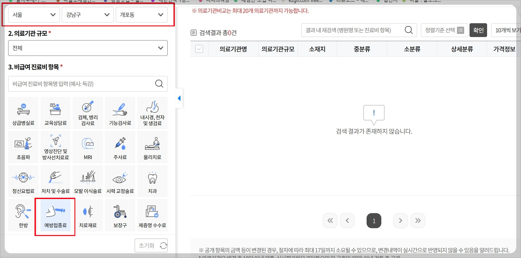 검색 하길 원하는 지역을 선택 한 후 아래의 예방접종료를 클릭하여줍니다.