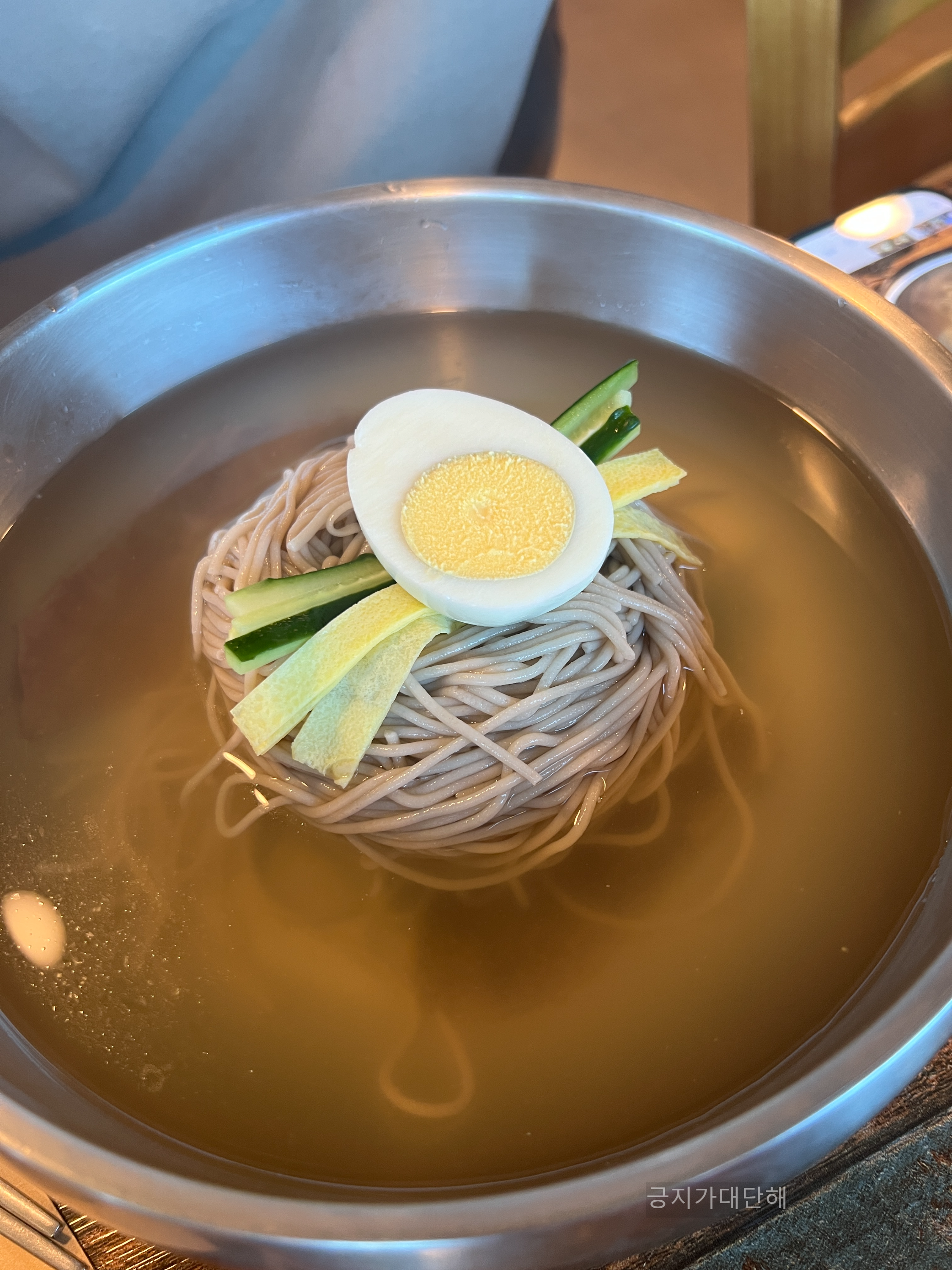 평양냉면은 사실 처음 먹어보는데 맑은 육수가 눈에 띄더라고요. 육수 먼저 한 모금 마셔보았는데 육향의 깊이가 남다른 걸 느낄 수 있었습니다. 거기에 구수한 메밀면의 조화가 자극적이지 않고 편안하고 단정했습니다.