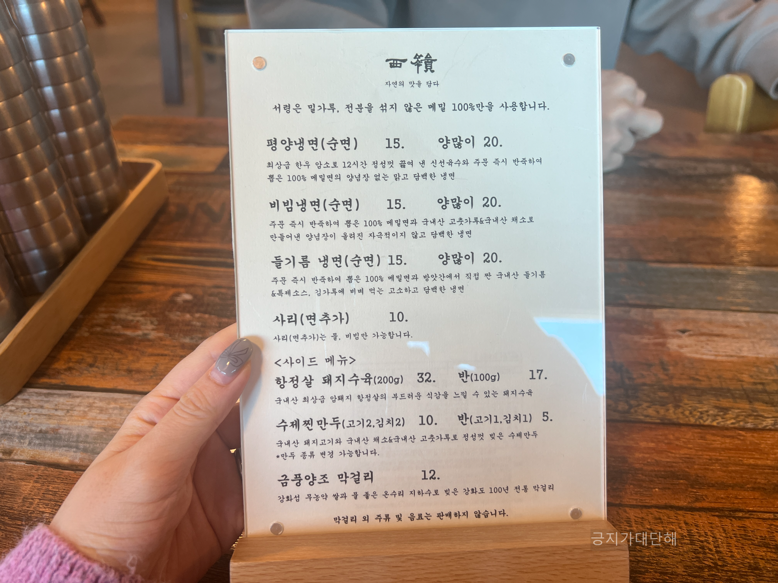 메뉴판입니다. 메뉴는 단출했어요. 평양냉면, 비빔냉면, 들기름 냉면, 항정살 돼지수육, 수제 찐만두 이렇게 있었습니다. 냉면은 1인분 15,000원으로 가격이 조금 비싼듯한 느낌이 들기도 했습니다. 거기다가 사리 추가를 하게 될 경우 5,000원~ 10,000원 추가.