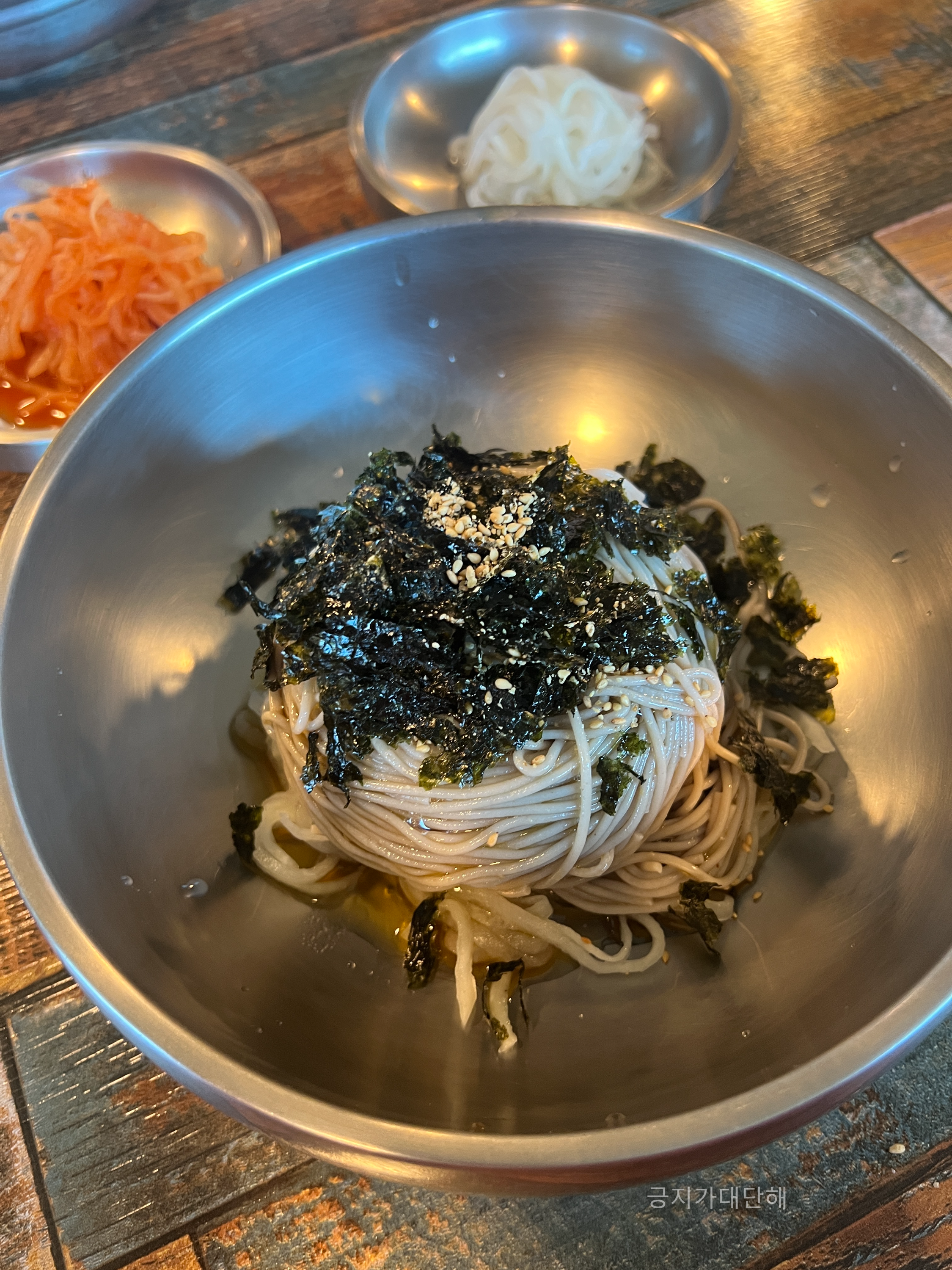 들기름 냉면 같은 경우는 김가루에 비비는 순간 들기름의 향기가 확 풍겨지는 게 직접 짠 들기름이라고 확신할 수 있었습니다. 단짠단짠 한 맛에 아래에는 무생채가 깔려있는데 그 조화가 꽤 만족스웠어요.
