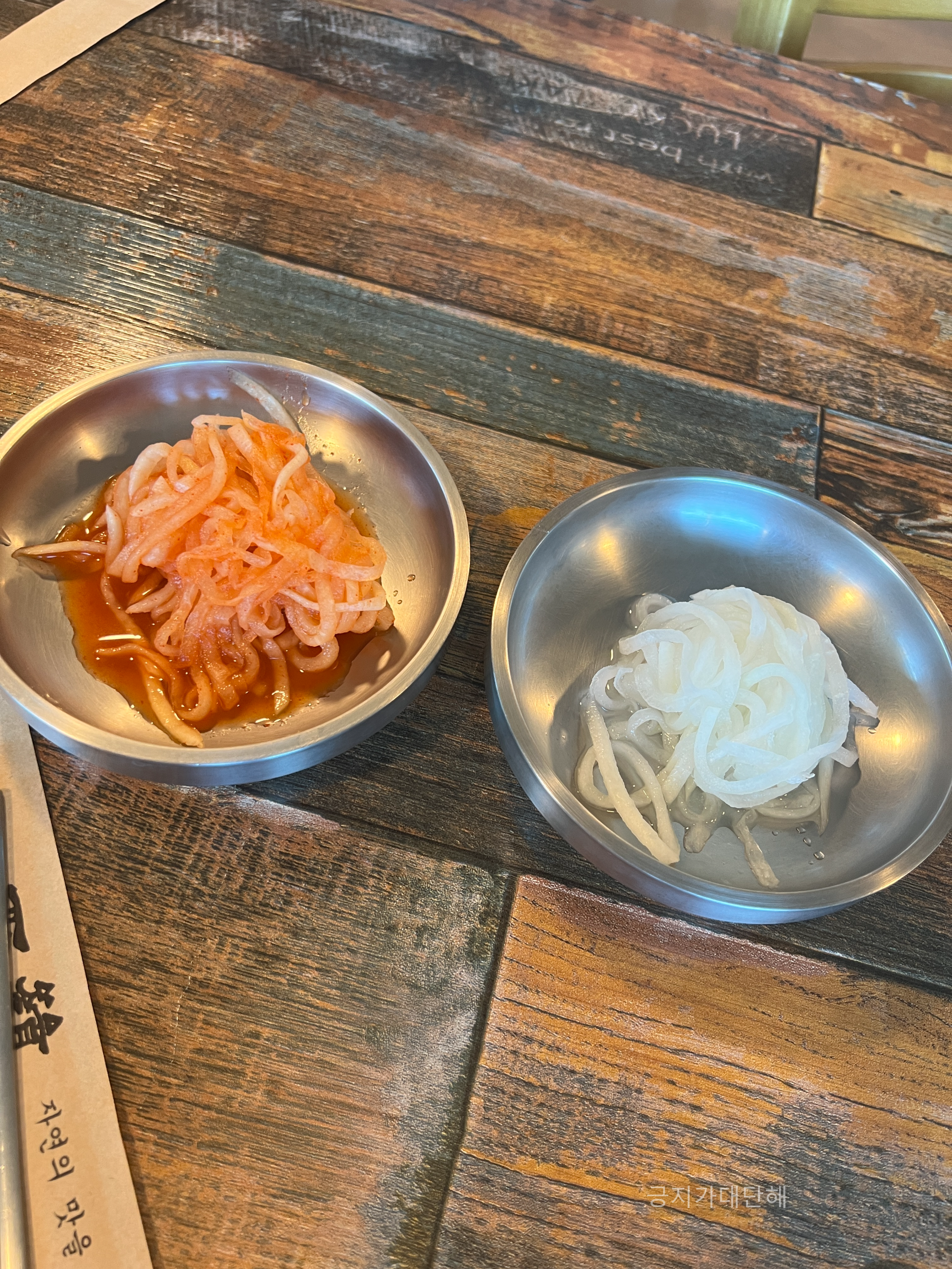 저희는 들기름 냉면과 평양냉면을 주문했습니다. 기본찬으로 무생채가 2가지 나왔습니다. 하나는 빨갛고 하나는 하얀데 맛에서 크게 차이가 나지는 않더라고요. 심심하고 새콤하니 자극적인 맛은 아니었습니다.
