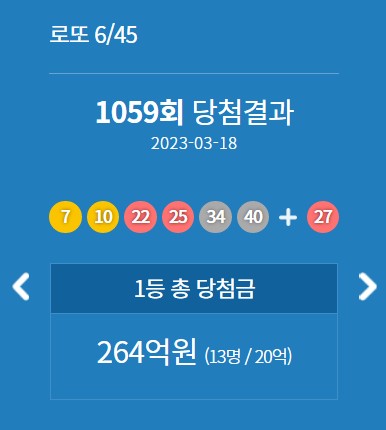 로또 6/45 1059회 로또 당첨번호는 7, 10, 22, 25, 34, 40으로, 추가 보너스 번호는 27입니다. 지난 1058회 당첨번호와는 25번과 40번이 중복됩니다. 이번회차 당첨 금액은 약 20억 원씩으로 세전 금액입니다.