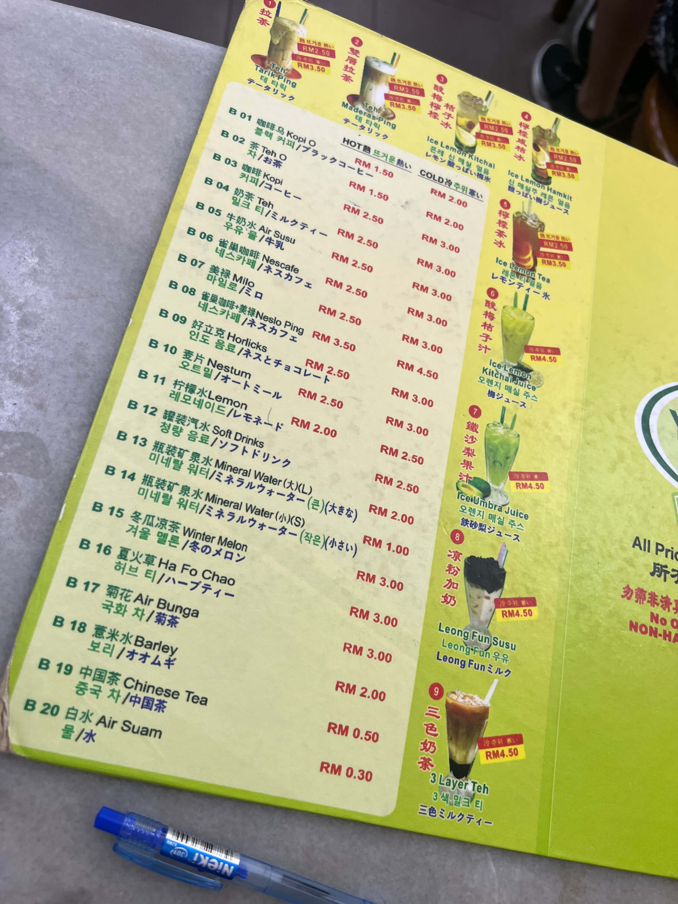 이펑락사의 메뉴판입니다. 락사 가격이 10링깃으로 한국돈 약 3,000원이 안 되는 가격입니다. 코타키나발루 물가는 대체적으로 저렴한 듯하며 10링깃에 300원 정도라고 생각하시면 가격 계산 하기가 편합니다.