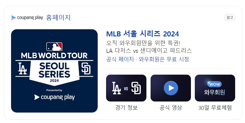 자세한 티켓팅 일정은 아직 나오지 않은 상태이며, 1월 말 티켓 예매를 진행할 예정이라고 합니다. 국내 최초로 MLB의 공식 파트너사로 선정된 쿠팡플레이에서 예매가 가능합니다. 이 말은 곧 쿠팡 와우 회원만 예매를 할 수 있다는 점입니다. 해외에서도 많은 관심을 가진 경기인만큼 국내외 팬들의 피 터지는 티켓팅이 예상됩니다만, 쿠팡 플레이는 해외에서는 접속이 불가능하여 국내팬들이 조금 더 유리하지 않을까 싶습니다.