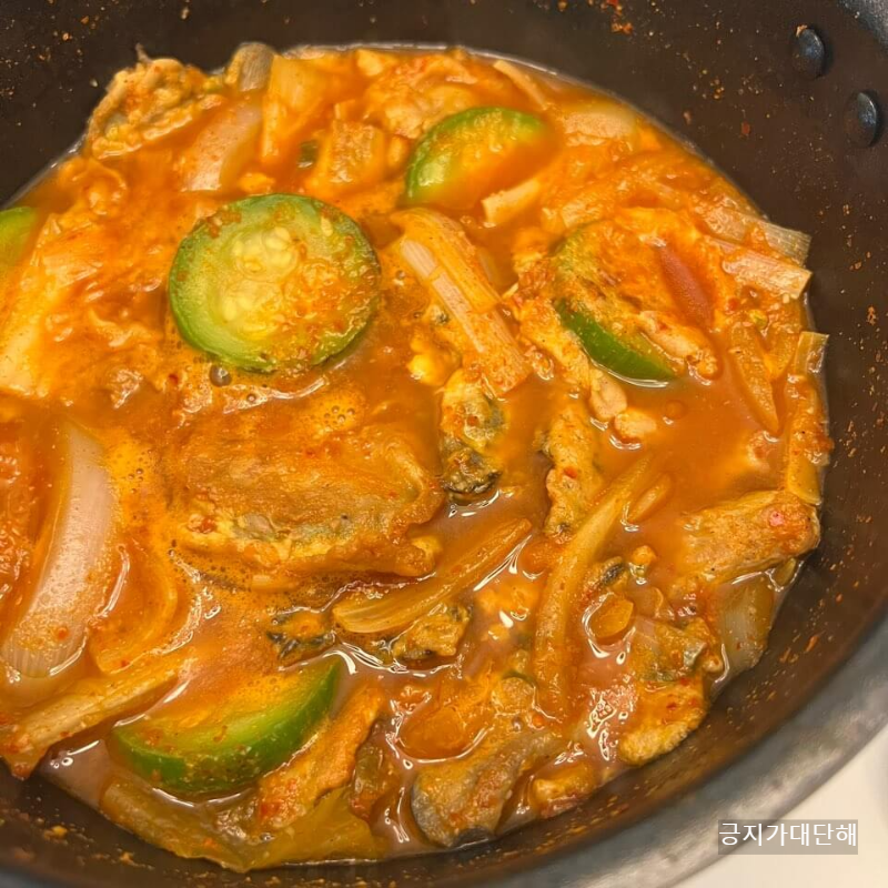 완성된 칼칼한 전찌개! 고명으로 대파를 올려주어도 되지만 바로 먹을거라 과감하게 패스 합니다. 전만 넣는게 부족하다 싶으시다면 스팸이나 소세지, 두부 등등 재료를 추가 해서 만들어 주셔도 됩니다.