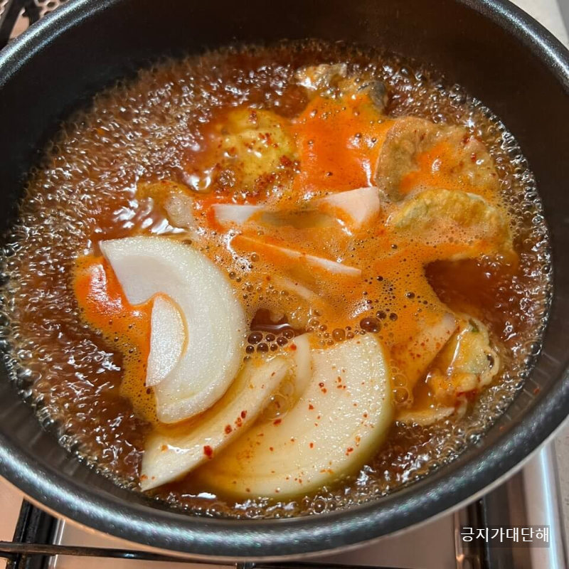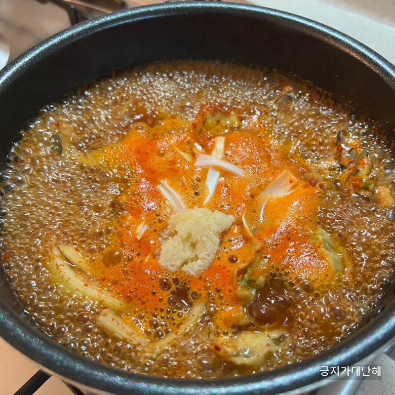 육수가 끓어오르면 냉동 전을 해동 하지 않고 바로 넣어줍니다. 그리고 만들어둔 양념장을 넣어주는데 이때 간을 봐주면서 넣어주세요.