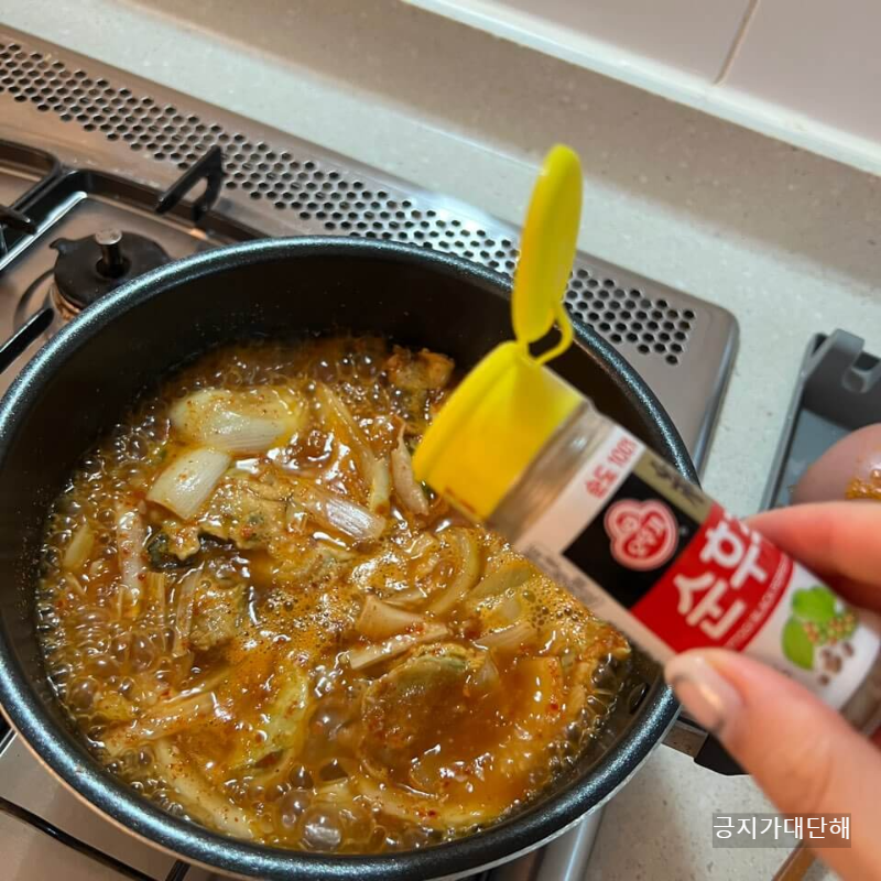 바글바글 끓어 전이 냉동된 전이 풀어지는듯 하면 양파와 마늘 김치를 넣어줍니다. 김치는 넣으셔도 되고 안넣으셔도 되지만, 김치를 넣는 편이 조금 더 시원한 맛을 느낄 수 있는 전찌개를 만들어 주더라구요. 다익은듯 하면 마무리로 후추를 뿌려 줍니다.
