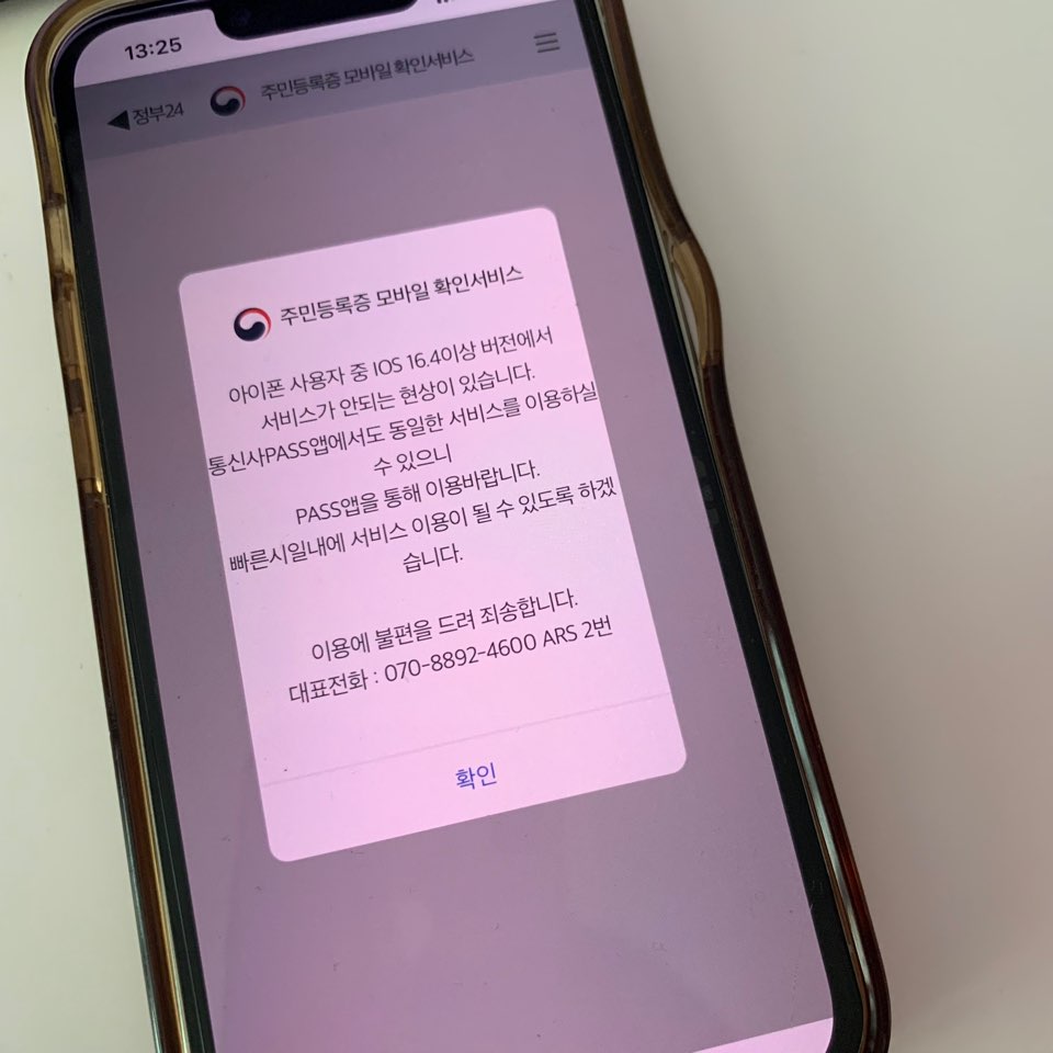 정부 24 앱에서 모바일 신분증 발급 한 뒤 다시 한번 확인해보려고 들어갔더니 서비스 이용할 수 없다는 팝업이 뜨더라구요. 이래서 아이폰 사용자는 PASS 앱을 사용하여 모바일 신분증을 발급하라는것 같습니다.