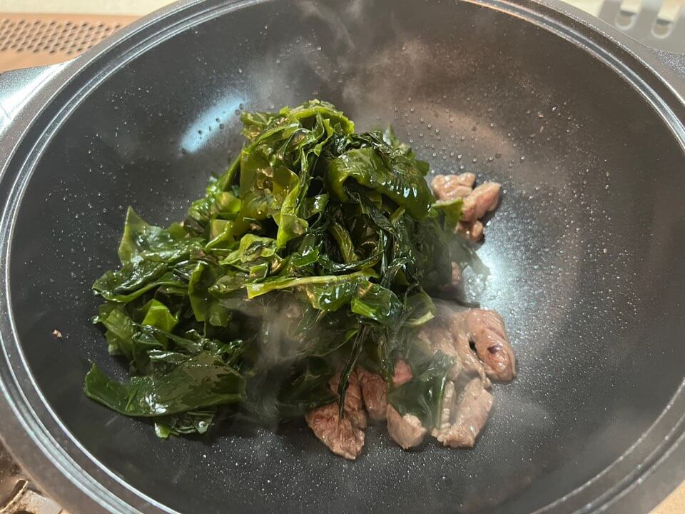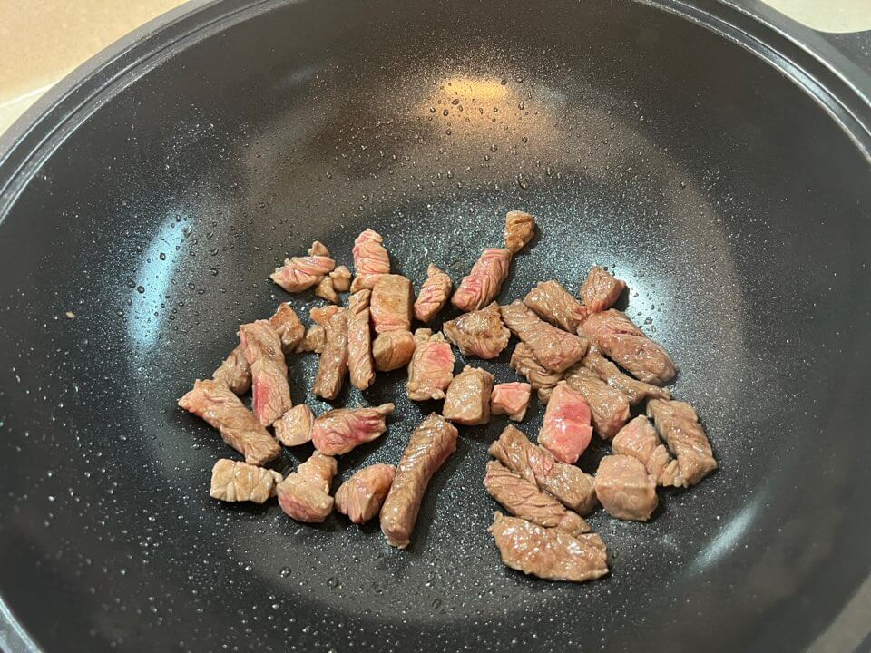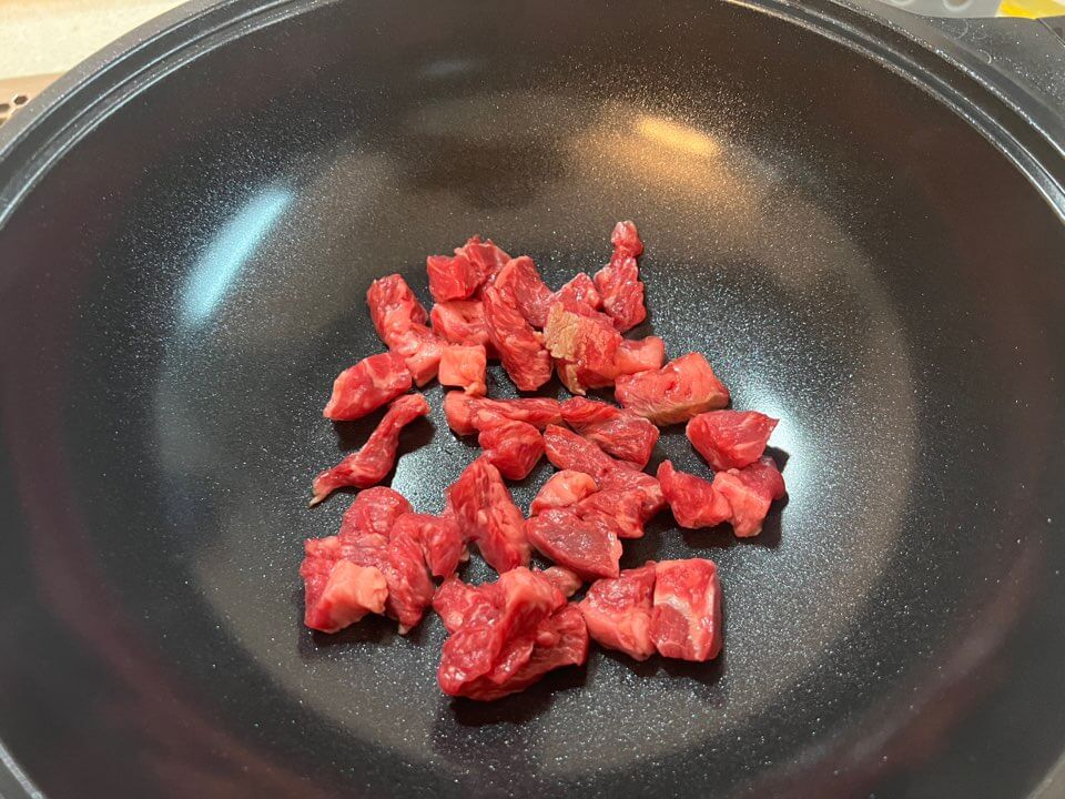 - 미역이 불어서 준비가 됐다면 소고기 미역국 끓일 준비는 완성입니다. 소고기는 마른 팬에 넣고 볶아줍니다.