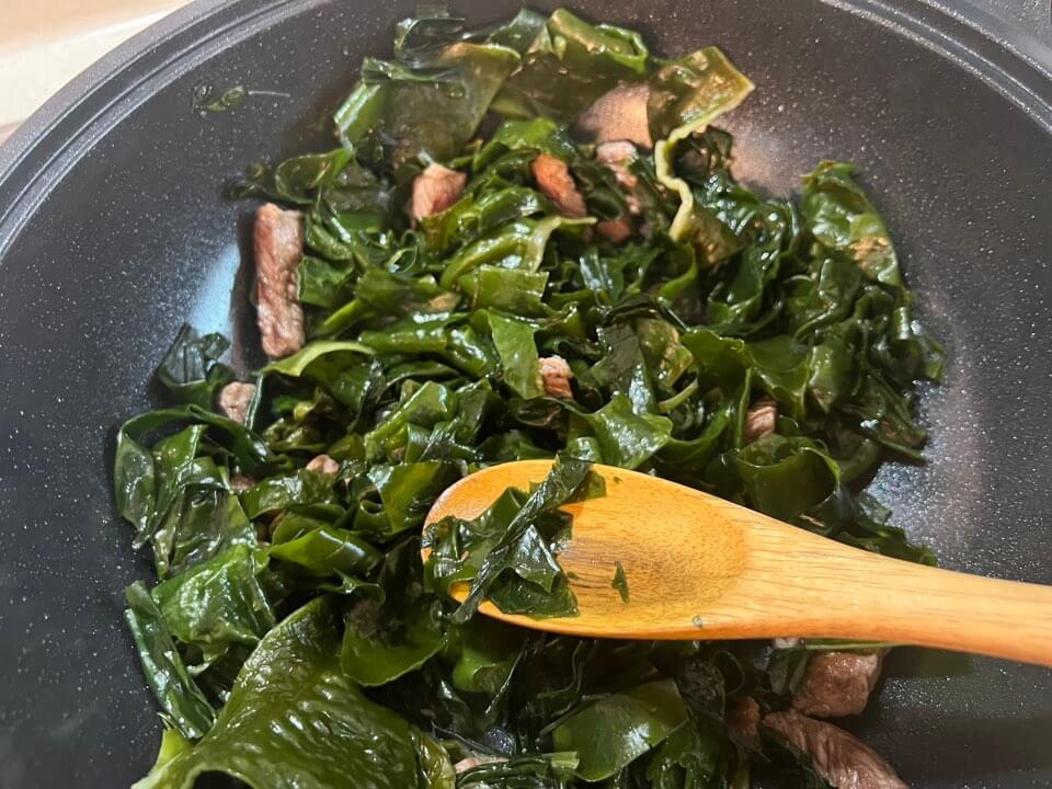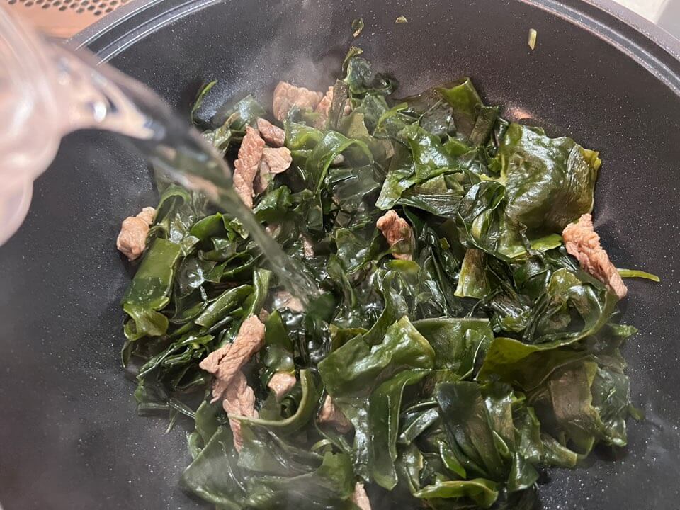 - 고기에 핏기가 어느 정도 빠졌다면 불린 미역의 물기를 꾹 짠 뒤 넣어줍니다.