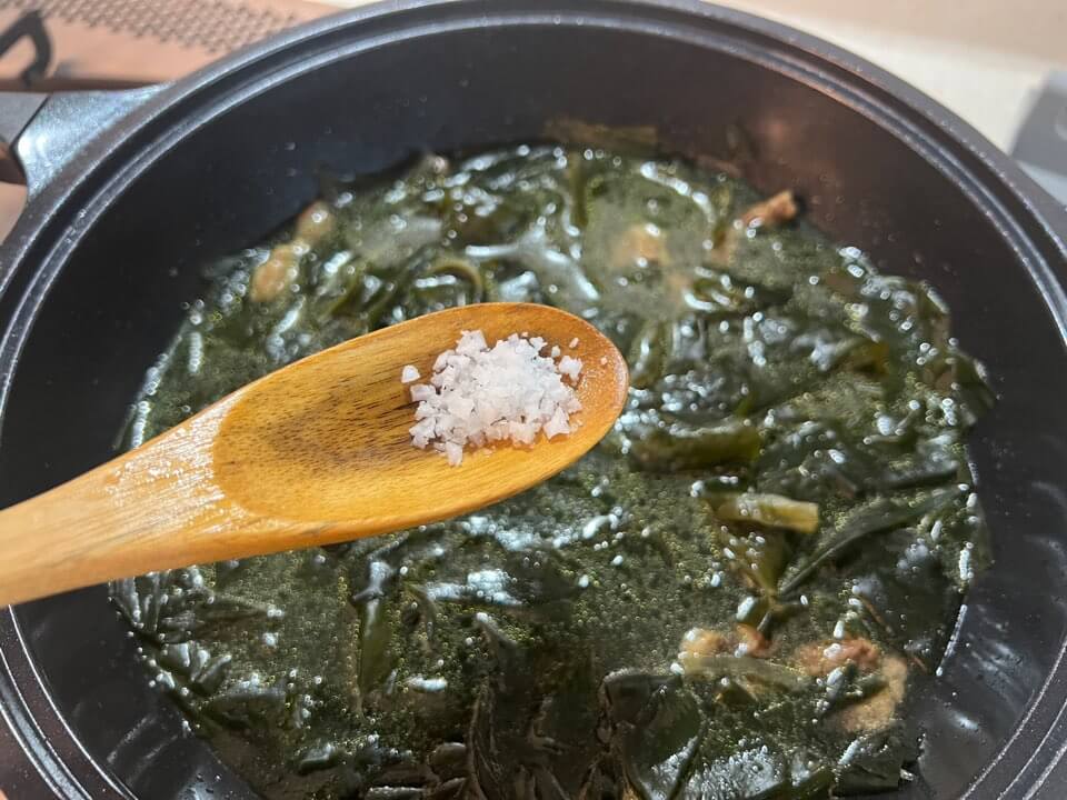 - 어느 정도 오래 끓였다 싶으시면 간을 보고 부족한 간을 소금으로 해주세요. 국간장을 넣는다면 미역국의 색이 검어지기 때문에 주의해주세요