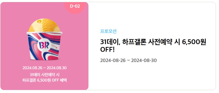배스킨라빈스는 31일을 맞이하여 31데이 이벤트를 진행중입니다. 31데이 사전예약시 하프갤론을 6,500원 할인에 1,000원 더 할인 해주는 이벤트 입니다. 하프갤런 가격은 31,500원으로 7,500원 할인 받아 25,000원에 구매 할 수 있습니다.