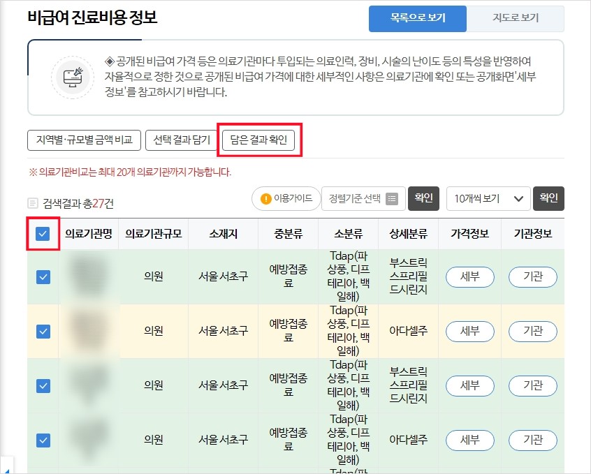 병원에 상관 없이 백일해 주사 예방접종 최저가를 확인하고자 한다면, 모든 병원들을 체크한 후 '선택 결과 담기' 후 '담은 결과 확인'을 눌러주시면 일일이 클릭하지 않아도 한 번에 조회할 수 있습니다.
