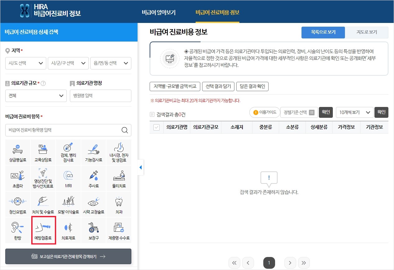 위의 사이트에 접속한 다음 내 지역을 선택한 후 비급여 진료비 항목인 '예방접종료'를 눌러줍니다.