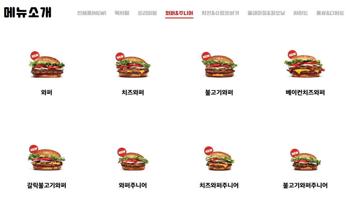 버거킹 홈페이지에도 보면 와퍼 메뉴가 여전히 있고 와퍼에 NEW라는 글자를 붙여 판매중이었습니다. 갑작스러운 와퍼 판매 종료 소식에 많은 소비자들은 혼란스러웠지만 이는 단종이 아닌 리뉴얼을 뜻하는 바로 노이즈 마케팅이었네요.