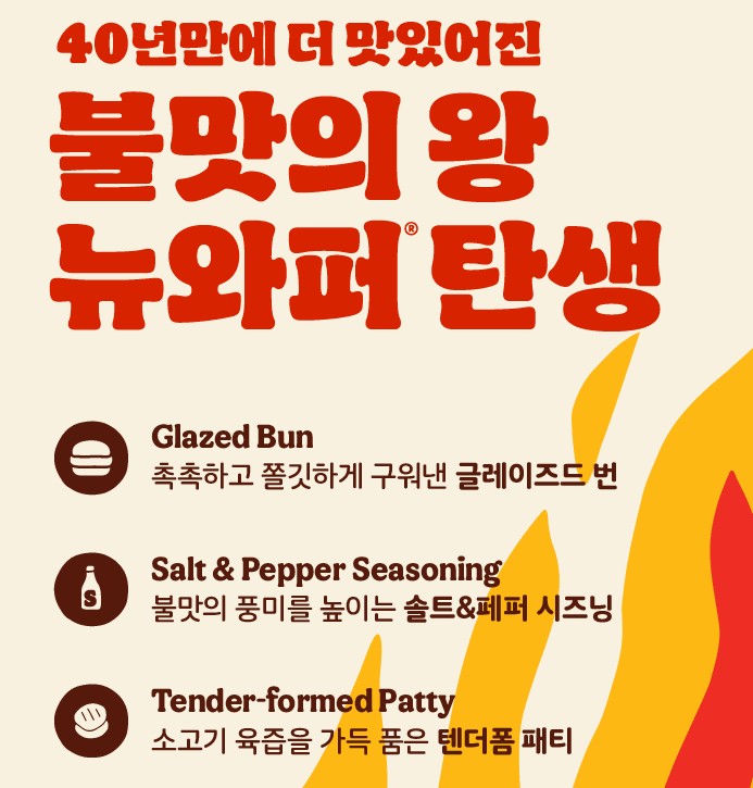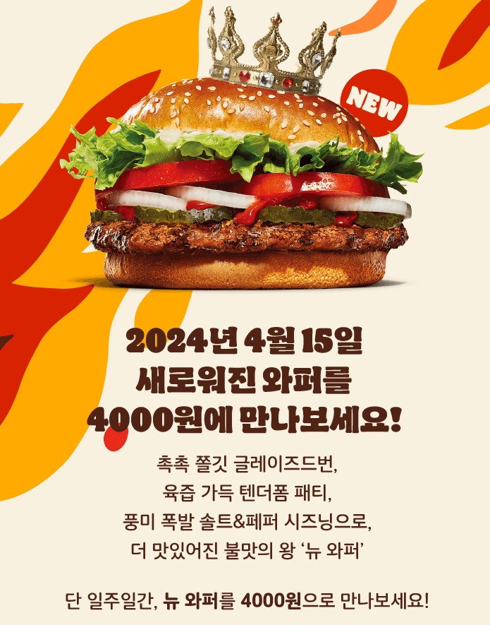 와퍼 40주년을 맞아 리뉴얼 된 뉴 와퍼 특별할인을 실시합니다. 와퍼가 뉴와퍼로 리뉴얼 되며 가격 인상이 예상됐지만 기존 와퍼와 같은 가격을 유지함과 동시에 뉴와퍼 할인 행사를 진행합니다.