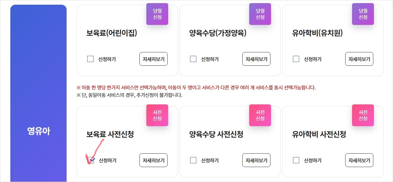 영유아 부분 보육료 사전신청, 양육수당 사전신청 등 필요한 복지 서비스에 체크를 한 뒤 맨 아래로 내려서 넘어가줍니다.