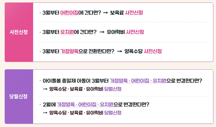 어린이집을 처음 보내는 만0세 부모들은 사전신청와 당월신청의 차이가 헷갈리실 수도 있을것 같습니다.