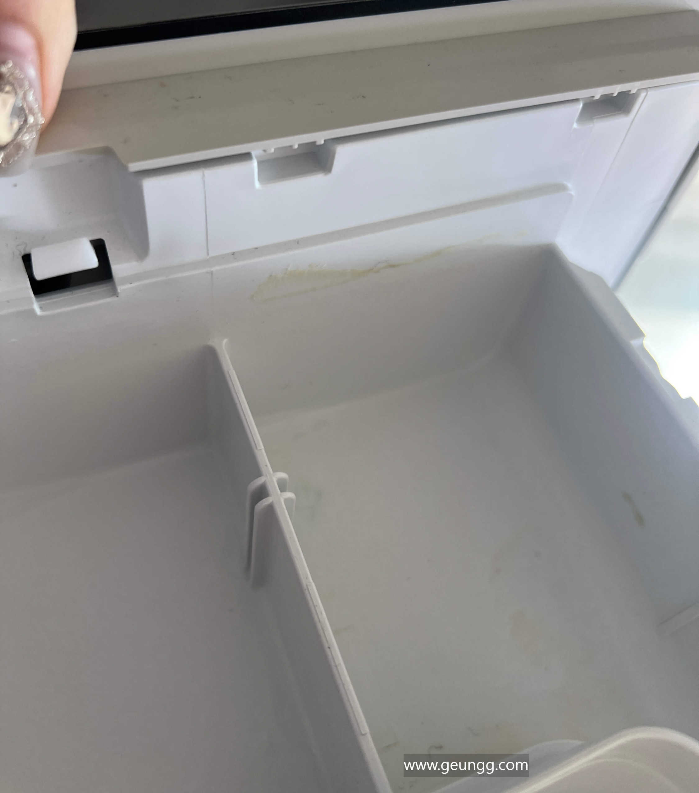 다음은 세제함의 서랍 청소입니다. 세제함뿐만 아니라 세제함을 품고 있던 서랍에도 세제와 유연제가 굳어있는 모습을 보실 수 있습니다. 이 부분 또한 솔이나 수세미를 이용하여 부드럽게 문질러 제거해 주세요. 이 세제함 또한 물기를 털어 자연건조 해줍니다.
