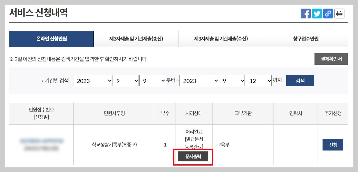 발급이 완료 되었다면 문서출력을 눌러 생활기록부를 확인 또는 출력해 줍니다.