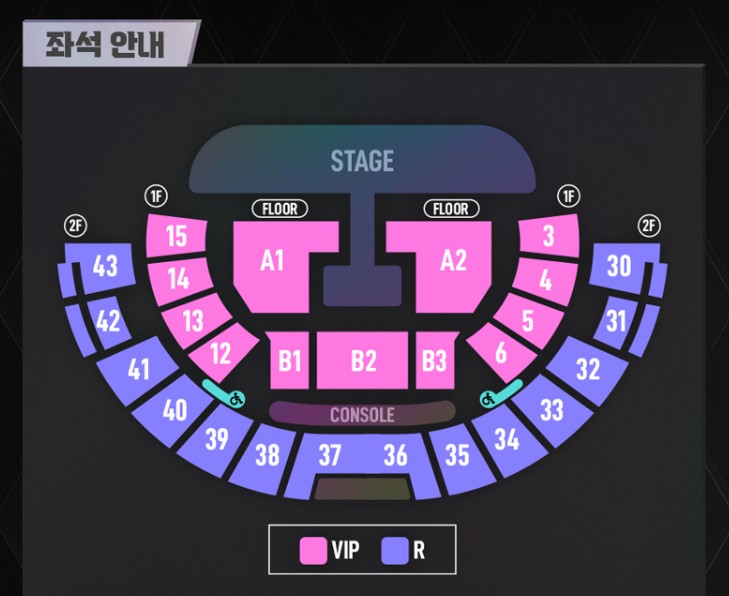 전면에 크게 본무대가 있고 작게 T모양으로 돌출 무대가 꾸며져 있습니다. 핑크색 구역이 VIP 구역, 보라색 구역이 R석입니다. Floor A구역은 스탠딩 구역으로 입장 번호 순서대로 입장하게 되며, 해당 구역 내에서 자유롭게 공연 관람이 가능합니다. Floor B구역은 단차가 없는 평지에 의자가 설치되는 곳으로 앞사람에 의해 시야가 가려질 수도 있겠습니다. 그 외 구역은 계단식 좌석으로 무대와 멀긴 하겠지만 단차가 있어 시야 확보에는 더욱 좋을 것으로 예상됩니다.