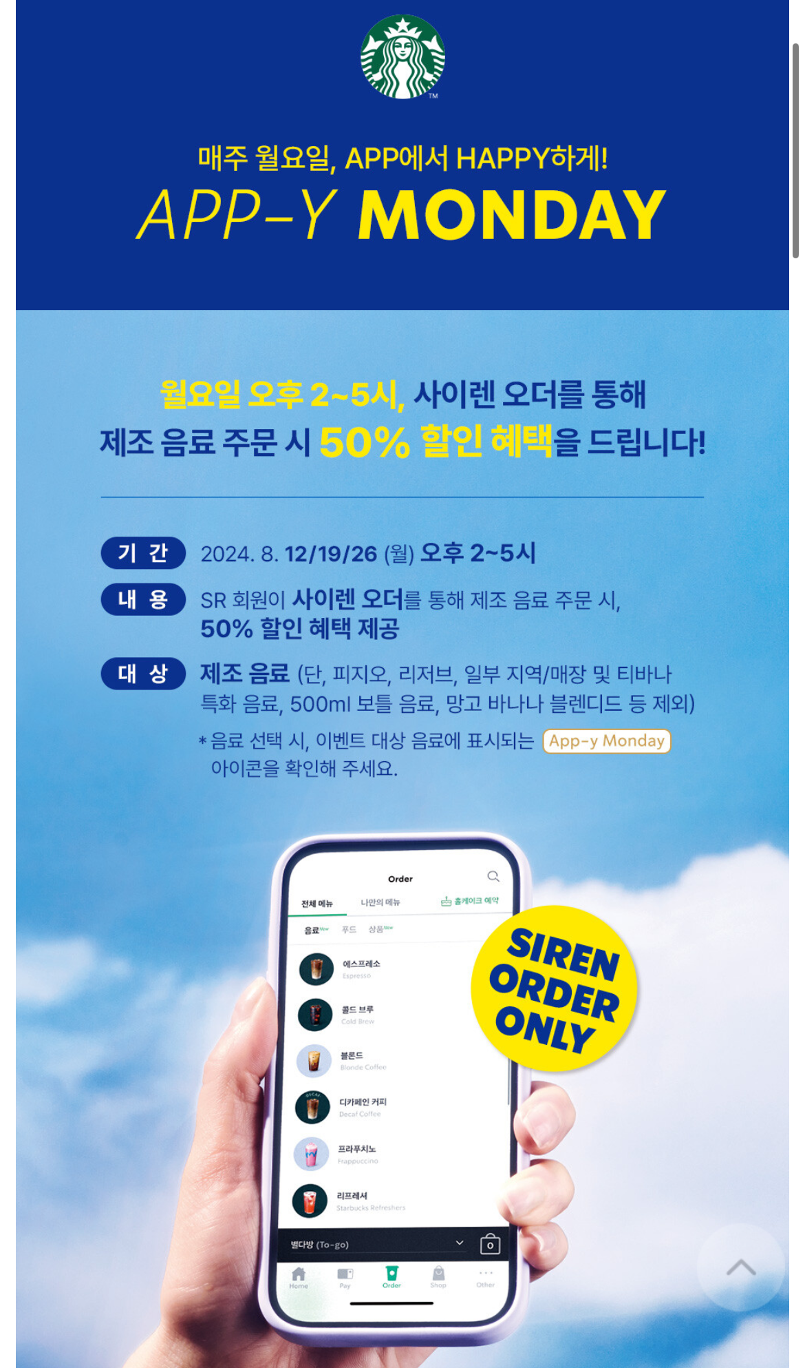 스타벅스 SR회원을 대상으로 매주 월요일 오후 2시에서 5시 사이 사이렌 오더를 통해 제조음료 주문 시에 50% 할인 혜택을 제공하는 이벤트입니다. 여기서 제조음료란 일반적으로 커피음료를 뜻하며, 스벅 메뉴 중에 피지오, 리저브, 지역 특화 음료, 500ml 보틀 음료, 망고 바나나 블렌디드를 제외한 메뉴를 뜻합니다.