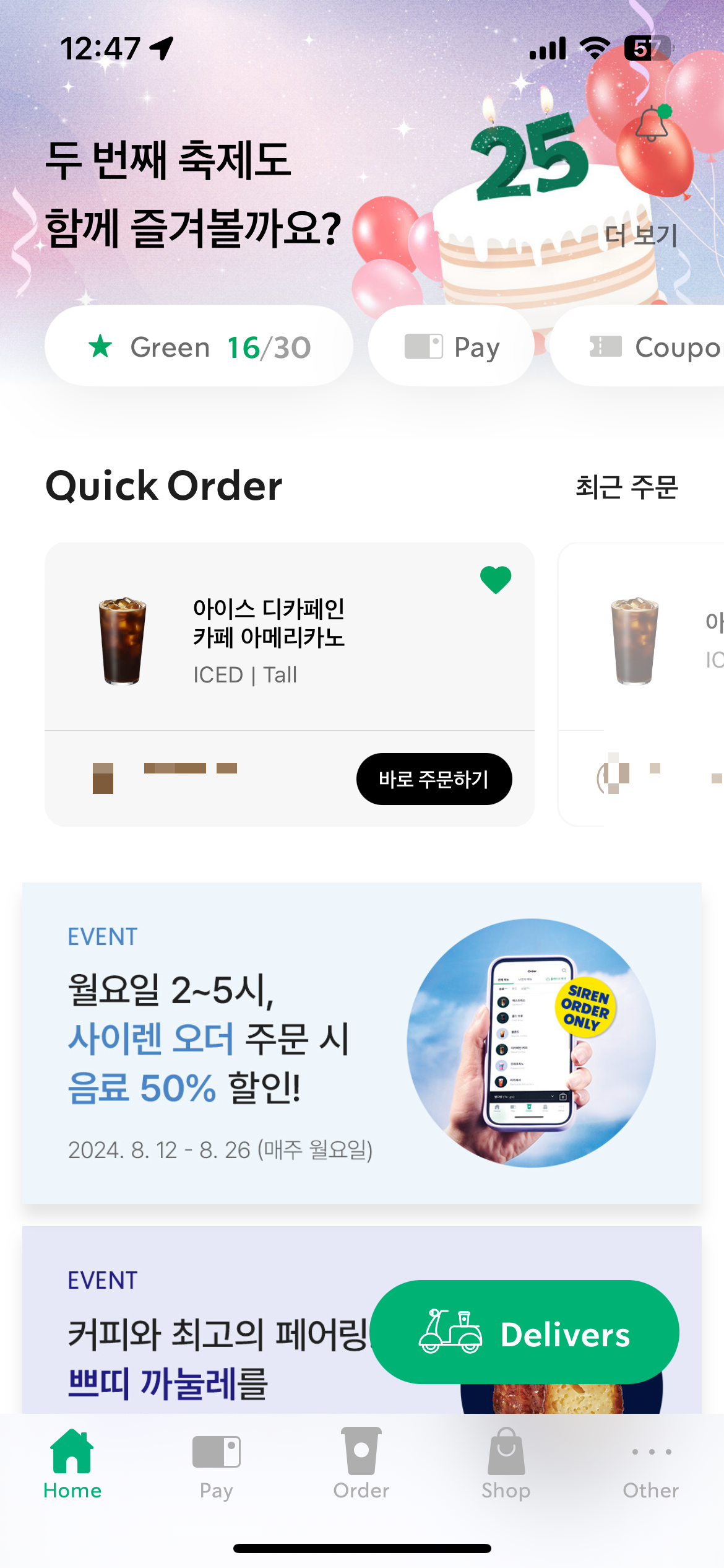 남은 8월 한달간 매주 월요일마다 50% 할인 혜택이 주어입니다. 수령 장소에 구애 받지 않고 할인 적용을 받을 수 있으며 단 스타벅스 매장 카운터 주문, 딜리버리 주문, 배달의 민족 주문, 네이버 주문 등 사이렌오더 주문 외의 주문은 할인 혜택을 적용 받기 어렵습니다.