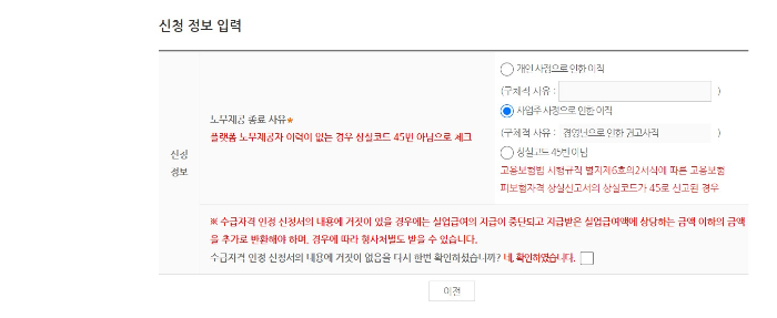 다음 항목은 수급자격 신청서를 작성하여 인터넷으로 제출하는 항목입니다. 개인정보, 이직사유, 장애인여부 등을 작성하는 부분으로 거짓 없이 사실만을 작성하여야 합니다.