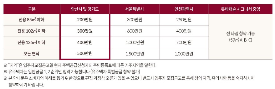 - 수도권 전 지역 거주가 청약 가능: 입주자 모집공고일 현재 경기, 서울, 인천 거주자가 청약 가능하며 경쟁이 있을 경우 안산시 거주자가 우선 됩니다.